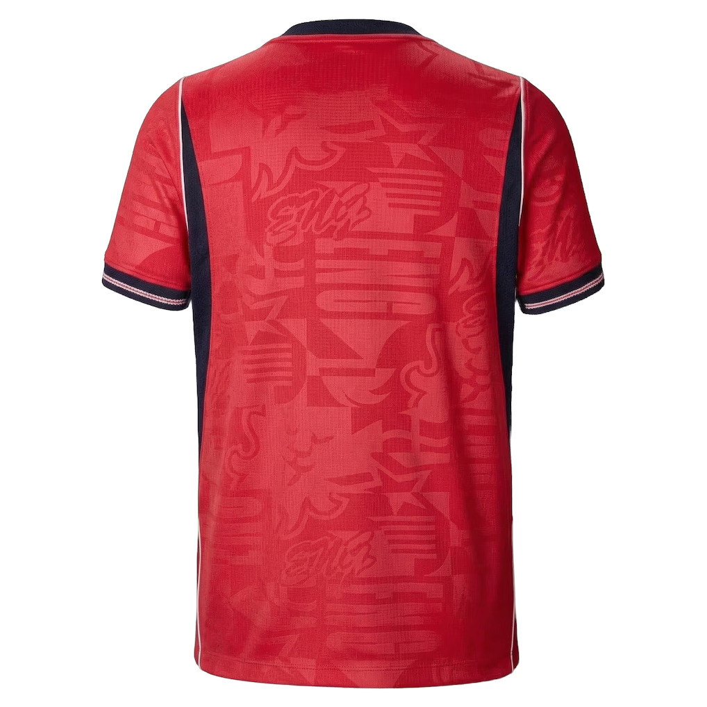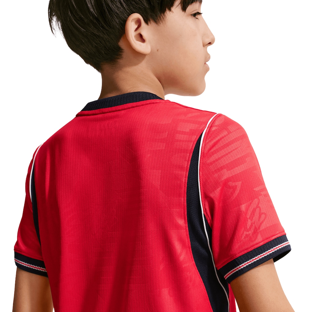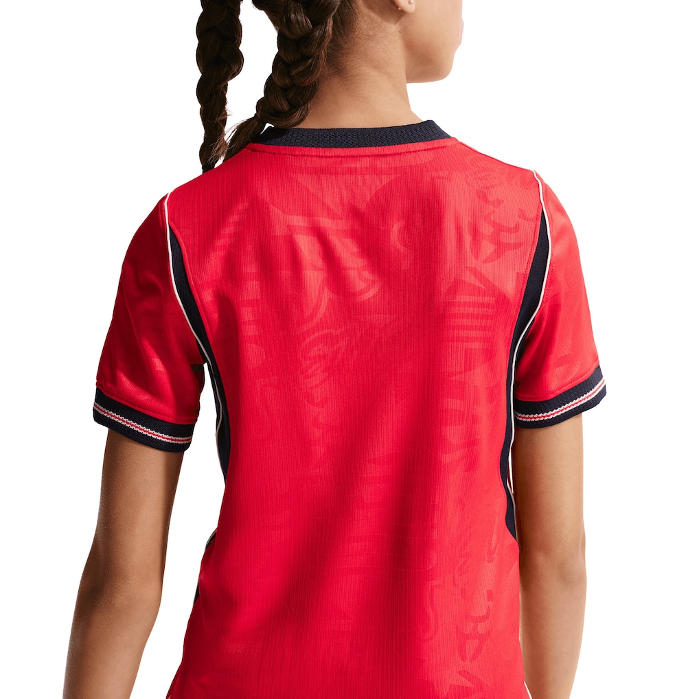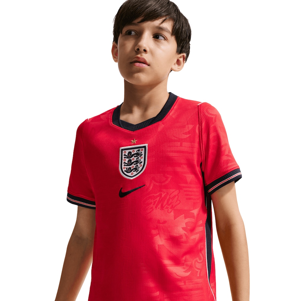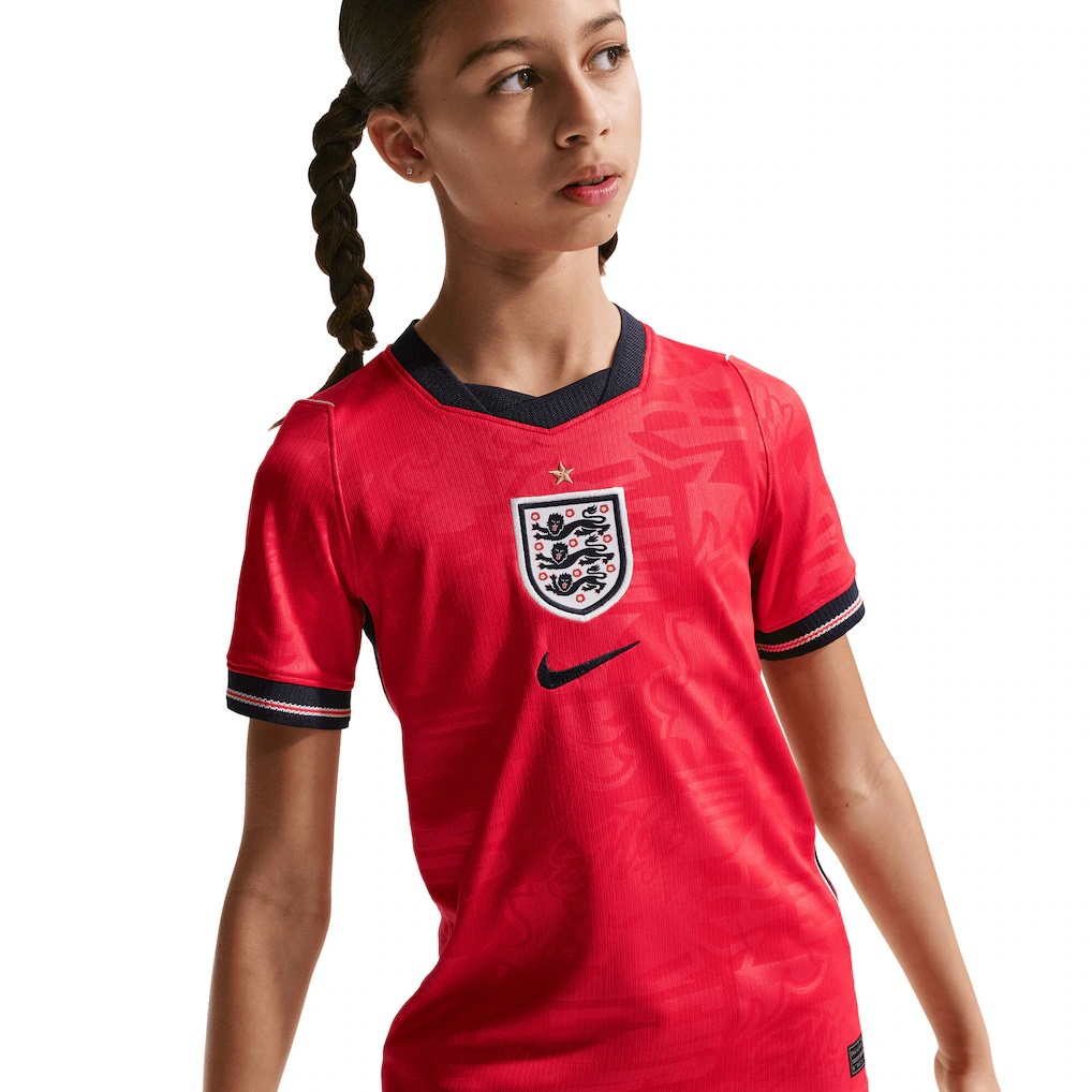 The Away kit marks a historic shift in England's visual identity, pairing a red top with navy shorts. This bold combination signals a future‑facing England, willing to challenge convention while remaining rooted in tradition. A centrally placed federation crest sits beneath the metallic gold star, reinforcing presence and pride.