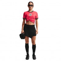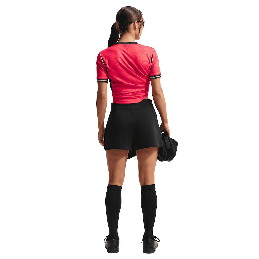 The Away kit marks a historic shift in England's visual identity, pairing a red top with navy shorts. This bold combination signals a future‑facing England, willing to challenge convention while remaining rooted in tradition. A centrally placed federation crest sits beneath the metallic gold star, reinforcing presence and pride..